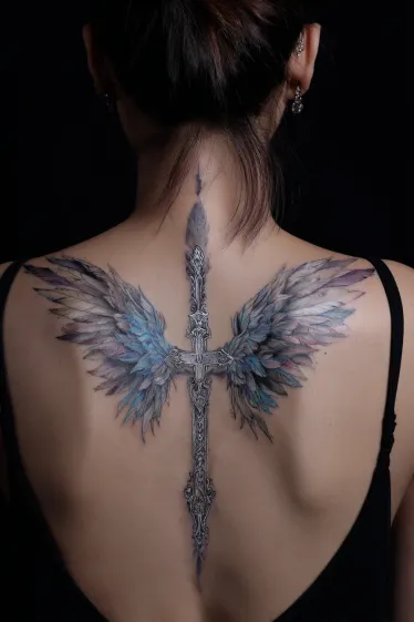 This powerful spine tattoo features an incredibly detailed, almost sword-like cross that runs elegantly down the back, adorned with intricate, gothic-inspired patterns. Flanking the cross are magnificent wings, rendered with soft, ethereal blues, purples, and grays, giving them a delicate, feathery appearance. The entire piece creates a stunning visual, blending elements of strength and grace beautifully.