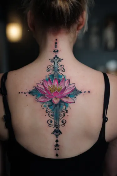 This absolutely stunning spine tattoo features a vibrant pink lotus flower beautifully centered on an ornate cross design. The cross itself has intricate, almost filigree-like details and is accented with gorgeous teal watercolor splashes that bleed out around the edges, creating a dreamy backdrop for the lotus. Delicate black dot work and swirling patterns extend upwards and downwards along the spine, adding to its elegant and spiritual vibe.