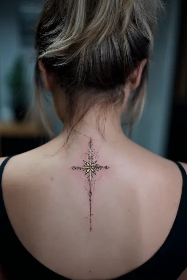 I just adore how intricate yet dainty this tattoo is, it is truly a work of art! The way the golden flower sparkles at the center of the cross adds such a lovely touch of warmth and light. I think it is perfect for someone who loves meaningful symbols but also appreciates a subtle, feminine design that enhances the beautiful line of the spine. It feels incredibly personal and effortlessly stylish, what a gorgeous choice!
