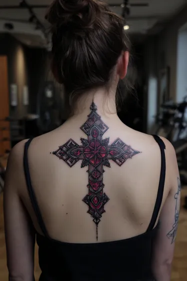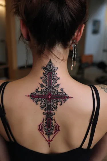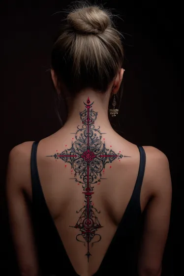This absolutely breathtaking spine tattoo features a stunning, highly ornate cross design, intricately detailed with dark, almost gothic patterns and vibrant ruby-red accents that truly make it pop. The center of the cross glows with a deep red, resembling a precious gemstone, and the detailed filigree work extends gracefully outwards and along the spine, creating a majestic and symmetrical masterpiece. It is a powerful piece that feels both antique and strikingly modern.