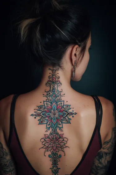 This breathtaking spine tattoo features a stunning, mandala-like floral design at its center, bursting with vibrant pinks and teals, all outlined in crisp black ink. Intricate scrollwork and smaller floral patterns extend gracefully upwards towards the neck and downwards along the spine, creating a mesmerizing, symmetrical piece that truly catches the eye. The overall design forms a stylized cross, blending spiritual symbolism with botanical beauty.