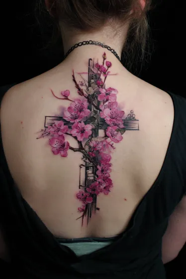 I am completely smitten with how this tattoo blends the strong, grounded symbol of a cross with the ephemeral beauty of cherry blossoms. It is such a poignant reminder of both strength and the delicate beauty of life’s fleeting moments. The way those stunning pink flowers just pop against the subtle cross is pure artistry, making it feel incredibly powerful yet undeniably feminine. This piece is seriously an inspiring choice for anyone wanting a tattoo with deep meaning and gorgeous visuals!