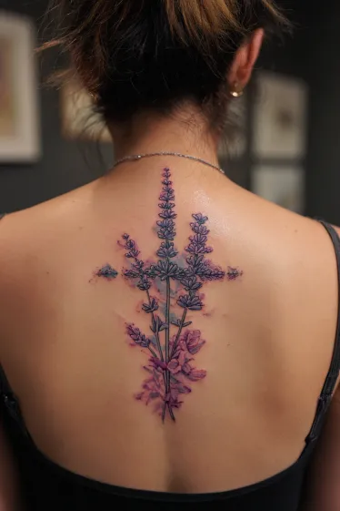 This enchanting spine tattoo beautifully arranges delicate lavender stalks and blossoms to form the shape of a cross. The flowers themselves are rendered in soft shades of purple and pink, with a lovely watercolor effect that seems to gently fade into the skin, giving it a dreamy, ethereal look. The slender stems and clustered flowers create an organic, graceful design that perfectly traces the line of the spine.