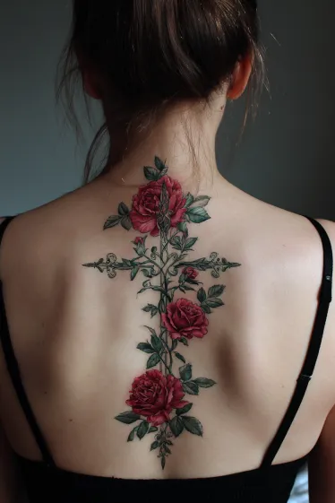 This captivating spine tattoo showcases a rustic cross design, beautifully adorned with lush, deeply hued red roses and vibrant green leaves that wrap around it. The roses are rendered with incredible detail, looking almost velvety, and they spill over the arms of the cross, creating a lively and organic feel. The cross itself has a textured, almost weathered appearance, providing a striking contrast to the fresh botanical elements.