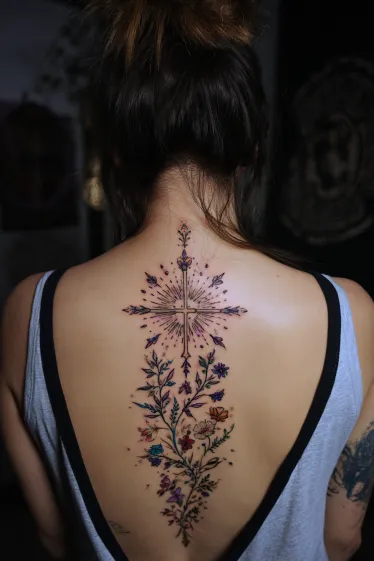 This enchanting spine tattoo showcases a delicate cross design at the upper back, radiating with intricate lines like a guiding star and adorned with subtle ornamental touches. Flowing gracefully from beneath the cross is a beautiful vine, intricately detailed with a medley of small, colorful wildflowers and lush leaves. The tiny blossoms feature soft hues of purples, blues, oranges, and reds, creating a truly organic and vibrant pathway down the length of the spine.