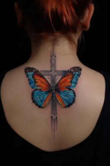 This absolutely stunning spine tattoo features a gorgeously detailed butterfly, boasting vibrant orange and blue wings that spread out beautifully over a sleek, modern cross design. The cross itself has clean lines and subtle shading, running elegantly down the spine. The butterfly is perfectly centered, creating a powerful visual of freedom and faith all in one.