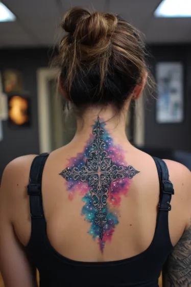 This absolutely breathtaking spine tattoo showcases a stunning, intricately detailed cross design set against a vibrant galaxy backdrop. The cross itself features ornate, almost filigree-like patterns in dark tones, creating a beautiful contrast with the ethereal splashes of watercolor behind it. Those gorgeous blues, purples, and pinks swirl together like a cosmic nebula, dotted with tiny white specks that sparkle like distant stars, making the whole piece feel truly otherworldly and majestic.