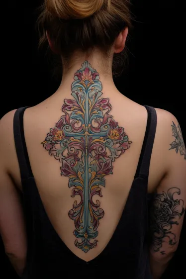 This absolutely stunning spine tattoo features an incredibly intricate cross design, bursting with vibrant floral and scrollwork details in a gorgeous palette of teal, pink, purple, and hints of golden yellow. The entire piece is richly adorned with flowing, symmetrical patterns that give it a luxurious, almost baroque feel, gracefully following the natural curve of the spine. The mix of bold outlines and soft colors makes it truly stand out.
