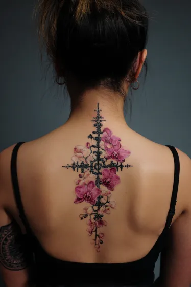 This absolutely captivating spine tattoo showcases a beautifully intricate cross design, rendered in dark, almost wrought-iron-like details. It is vibrantly adorned with a cascade of lush pink and soft white orchid flowers, along with delicate buds and leaves, that gracefully intertwine around the cross and trail down the spine. The contrast between the detailed dark framework and the soft, blooming florals creates a truly unique and striking visual.