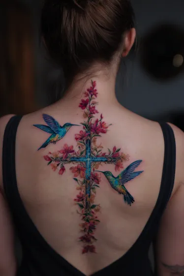 This incredibly vibrant spine tattoo features a beautiful cross, glowing with shades of blue and green, completely enveloped by a lush cascade of pink and red flowers with green foliage. Two stunning hummingbirds, with dazzling blue and orange feathers, gracefully hover on either side of the cross, as if feeding from the abundant blossoms. The entire design stretches down the spine, creating a lively and meaningful piece of art.