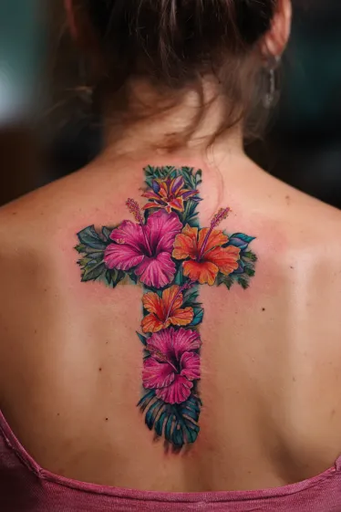 This incredibly vibrant spine tattoo features a cross design artfully formed by a lush arrangement of colorful hibiscus flowers and tropical leaves. The blossoms burst with rich shades of fuchsia and warm orange, complemented by deep green and teal foliage, making the entire piece feel like a blooming garden. The flowers are so beautifully detailed that they almost look real, creating a striking and lively visual down the back.