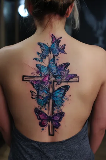This absolutely enchanting spine tattoo features a powerful cross design beautifully adorned with a flock of vibrant butterflies. The butterflies are rendered in a stunning array of blues, purples, and magentas, appearing to flutter and cluster around the cross, with some delicate watercolor-like splatters adding to the ethereal feel. The contrast between the solid lines of the cross and the delicate, colorful wings creates a truly captivating and lively design that stretches gracefully down the spine.