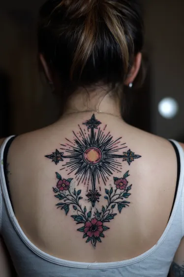 I am completely charmed by the way this tattoo combines such a powerful symbol with such delicate, natural beauty. The radiant star effect around the cross feels so hopeful and inspiring, and those little pink flowers add such a sweet, feminine touch. It is like having a little piece of guiding light and blooming growth etched onto your back, reminding you of strength and beauty every day. This design is truly enchanting and I think it would make anyone feel incredibly special.
