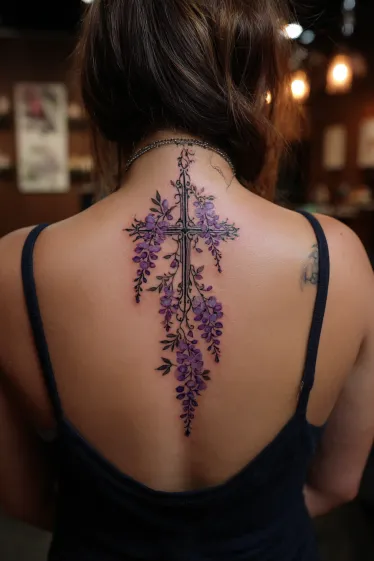 This enchanting spine tattoo features a beautifully intricate cross design, elegantly framed and almost overgrown with cascades of delicate wisteria flowers and leafy vines. The wisteria blossoms are rendered in stunning shades of purple, gracefully draping over the cross and trailing downwards along the spine, creating a wonderfully organic and flowing effect. The detailed dark lines of the cross provide a lovely contrast to the soft, vibrant blooms.