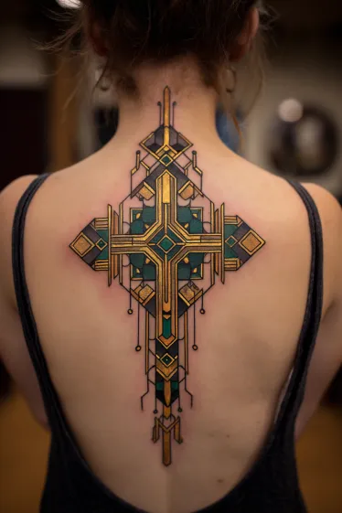 This absolutely stunning spine tattoo features a bold, geometric cross design with incredible Art Deco flair, running elegantly down the back. It is brought to life with a gorgeous palette of golden yellow, deep teal, and sophisticated black, creating a rich and luxurious feel. The intricate lines and shapes give it a symmetrical, almost architectural elegance, while subtle linear extensions add to its unique and modern appeal.