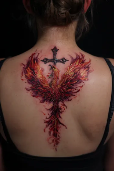 I am completely awestruck by the sheer power and beauty of this tattoo. The phoenix symbolizes rebirth and resilience, and pairing it with a cross creates such a profound statement of hope and strength. I love how the fiery colors just leap off the skin, giving it such a dynamic and unforgettable presence. This piece is truly a masterpiece that feels both incredibly meaningful and undeniably striking, making it perfect for anyone who wants a tattoo that truly tells a story.