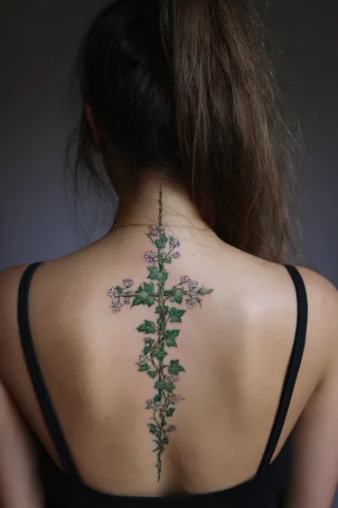 This enchanting spine tattoo depicts a beautiful cross shape formed by intertwining green ivy vines, adorned with delicate small white and light pink flowers. The vines are realistically rendered with subtle thorns, giving the piece an organic and wild charm. It gracefully extends down the length of the spine, creating a natural and flowing vertical design.