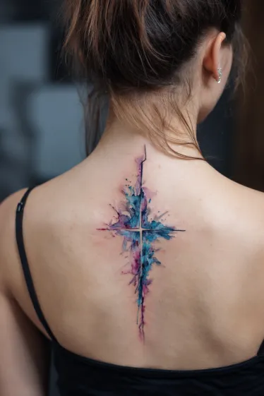 This absolutely captivating spine tattoo features a powerful cross design, bursting with an explosion of watercolor in stunning shades of blue, teal, and magenta. The colors beautifully bleed and splatter around the central cross, giving it a dynamic and artistic feel. Thin black lines define the cross itself, which also extends gracefully downwards along the spine, blending a strong symbol with expressive, fluid artistry.