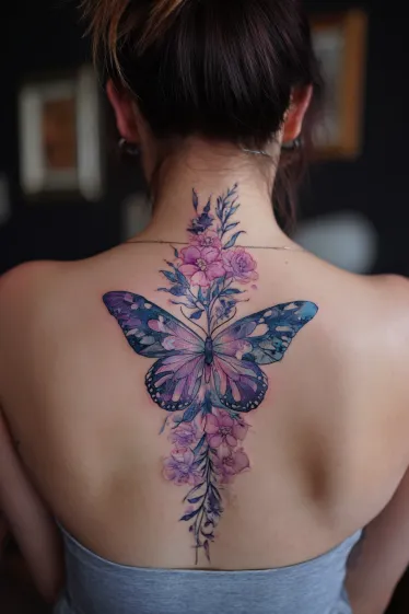 This tattoo is a stunning blend of nature and elegance, with a large butterfly stretching its wings across the upper back and delicate flowers trailing down the spine. The soft purples, blues, and pinks bring a dreamy watercolor effect, while the intricate details in the wings make the butterfly look almost alive. The flowers add a graceful flow that guides the eye down the spine, creating balance and beauty in equal measure.