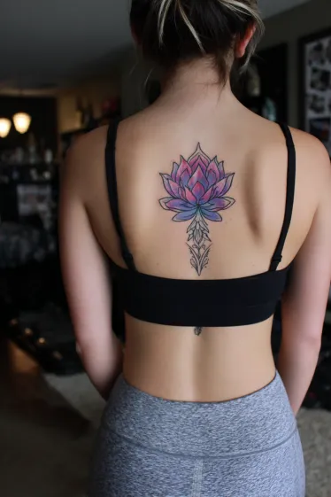 This tattoo features a large lotus flower blooming in the middle of the back, with layered petals shaded in soft purples, blues, and pinks. The petals are detailed with clean black outlines that make the colors pop beautifully. Beneath the flower, a delicate stem design trails downward, giving the whole piece a balanced and elegant vertical flow along the spine. It feels feminine yet powerful, almost like the flower is glowing against the skin.