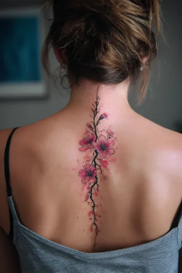 This tattoo shows a graceful branch of cherry blossoms running down the spine, with soft pink petals accented by hints of watercolor shading. The flowers look delicate and airy, almost as if they’re caught in a gentle breeze, while the thin black branch adds contrast and structure. The design feels both natural and artistic, creating a beautiful flow that highlights the length of the back.