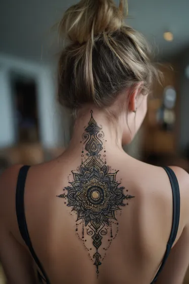 This tattoo is a breathtaking mandala design that flows perfectly along the spine. It’s made up of intricate geometric patterns layered in a symmetrical way, with bold black lines and hints of gold that make the details pop. The placement emphasizes the natural curve of the back, turning it into a canvas for a piece of art that feels both delicate and powerful. Every small dot and swirl adds depth, giving it a mesmerizing look from every angle.