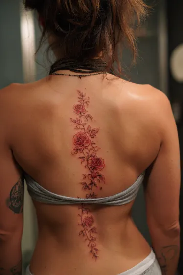 This tattoo is a delicate vine of roses climbing straight down the spine, with blossoms in rich shades of red and petals detailed in soft gradients. The leaves and stems are drawn in fine black lines that create a beautiful contrast with the boldness of the roses. The way the flowers are spaced along the spine makes the design feel balanced and elegant, giving it a natural flow that perfectly complements the back.