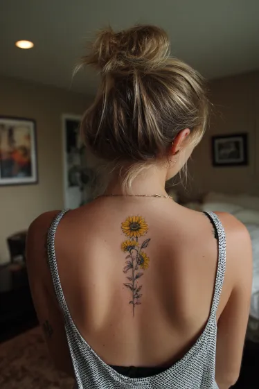 This tattoo features two sunflowers blooming along the spine, their golden yellow petals detailed with fine shading and surrounded by soft green leaves. The flowers are stacked in a vertical line, making the most of the natural flow of the back. The design is simple yet striking, with the cheerful colors standing out beautifully against the skin.