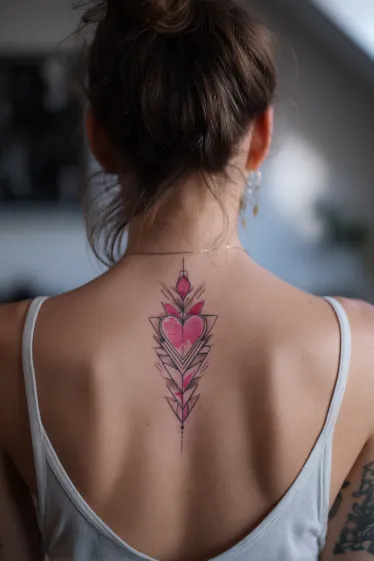 This tattoo shows a layered heart design flowing down the spine, with sharp geometric lines framing soft shades of pink. The bold symmetry gives it a striking look while the color keeps it playful and feminine. Each layer points downward in a way that naturally follows the back’s shape, making it both structured and elegant at the same time.