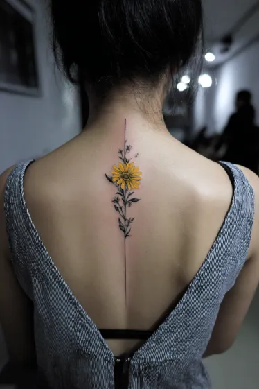 This tattoo features a single bright daisy blooming along the spine, with its golden yellow petals standing out against the delicate black stem and leaves. The design is clean and minimal, yet it has a graceful vertical flow that highlights the natural line of the back. The fine details in the leaves make it feel soft and organic, while the pop of color in the daisy gives it a cheerful energy.