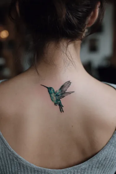 This tattoo features a delicate hummingbird in mid flight, placed high along the spine. The wings are shaded in soft greys while the body glows with shades of teal and green, giving it a lively and graceful appearance. The design is small and minimal, yet it carries so much movement and elegance that it instantly draws the eye.