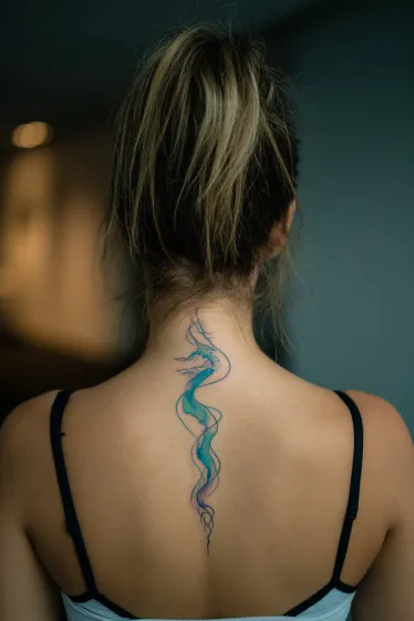 This tattoo features an elegant abstract wave flowing down the spine, painted in soft shades of teal and blue with hints of purple. The lines are thin and fluid, curling around each other in a way that looks almost like water in motion. It’s minimal yet artistic, giving the back a graceful and modern design that feels light and airy.