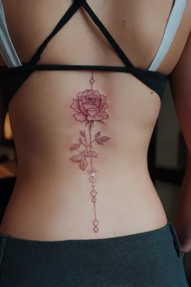 This tattoo features a single rose placed along the spine, detailed with fine black outlines and soft pink shading in the petals. The stem flows downward with small leaves and geometric accents that add an elegant touch. The clean vertical placement emphasizes the natural line of the back, making the design look both delicate and structured.