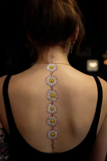 This tattoo features a line of daisies running straight down the spine, each flower perfectly stacked one after another. The petals are crisp and white with bright yellow centers, giving the design a cheerful pop of color. The neat vertical arrangement creates a clean and playful look, making it both eye catching and feminine.