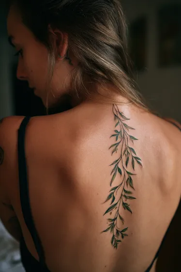 This tattoo features a graceful vine of leaves cascading down the spine, drawn in soft shades of green with delicate black outlines. The leaves are arranged naturally, almost as if they’re gently swaying, giving the design a flowing and organic look. It’s simple yet elegant, with the placement highlighting the natural line of the back beautifully.