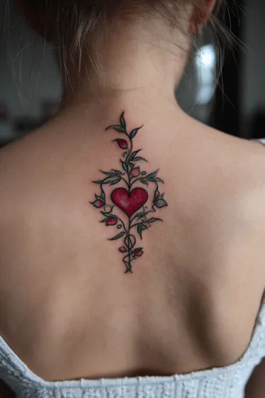 This tattoo features a bold red heart at the center with delicate vines and rosebuds winding up and down the spine. The green leaves and tiny red buds create a lovely contrast against the skin, while the heart remains the focal point with its rich, glossy shading. The design feels romantic and feminine, with the vines adding a graceful flow that naturally follows the line of the back.