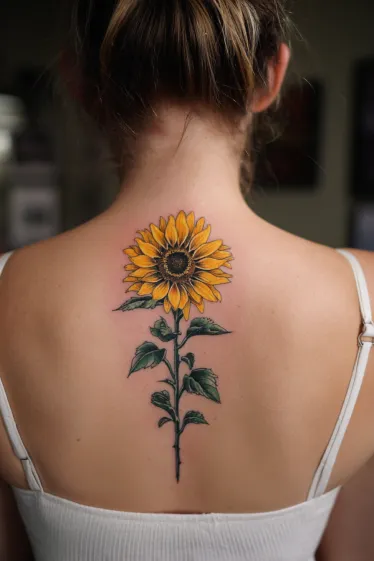 This tattoo showcases a tall sunflower placed beautifully along the spine, with bright golden petals and a detailed dark center. The stem runs straight down with bold green leaves that balance the flower’s vibrant color. The design is striking yet natural, filling the back with warmth and charm while still keeping a clean, vertical flow.