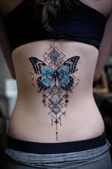 This tattoo features a large butterfly with bold blue wings, accented with black detailing that makes the colors pop. The wings are framed by intricate geometric shapes that extend vertically along the spine, giving the piece a structured yet whimsical balance. The mix of natural beauty with sharp, symmetrical patterns makes the design feel both elegant and powerful.