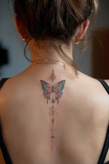 This tattoo features a delicate butterfly with wings shaded in soft pastel hues of pink, blue, and lavender. The butterfly sits gracefully at the upper back while a fine vertical line runs down the spine with tiny geometric accents and ornamental details. The design feels light and airy, almost like the butterfly has just landed, bringing a dreamy and feminine touch.