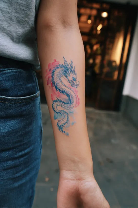 This small dragon features a blend of soft blue and pink tones on the inner forearm. The watercolor style gives it a playful and slightly whimsical look. The wings are highlighted in blue while the body fades into a soft pink, creating a gentle contrast.