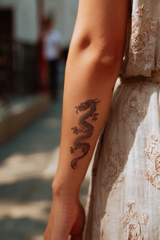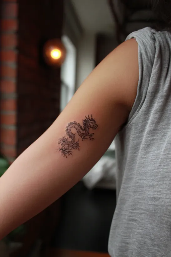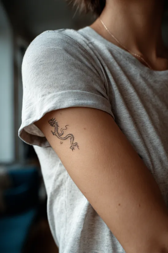 This small dragon is placed vertically along the outer upper arm, done in simple black ink with subtle detailing along the spine and wings. The design flows downward in a sleek line, giving it a refined and elongated look. Its size remains compact, keeping that soft subtle charm the article is all about.