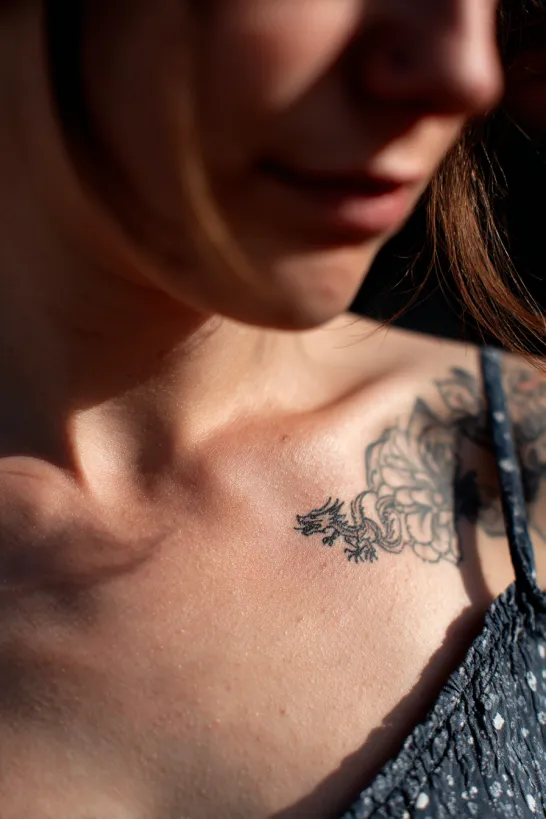 This small yet slightly more detailed dragon sits on the upper chest near the collarbone area. The black ink is richer here, with subtle shading that adds texture to the wings and scales. It remains compact in size, keeping that dainty charm, but the detailing gives it a bit more presence.