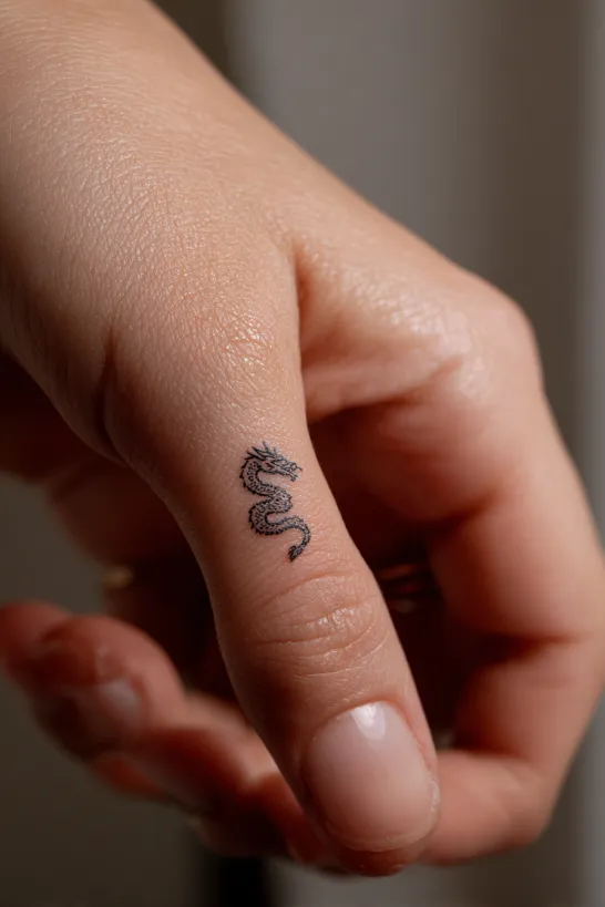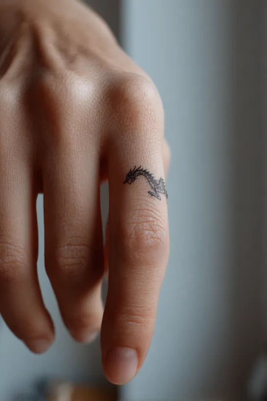 This ultra tiny dragon curves gently along the side of a woman’s finger in a minimalist fine line style. The body is slim and delicate, almost like a small piece of jewelry etched into the skin. The wings are barely there, keeping the design light and airy.