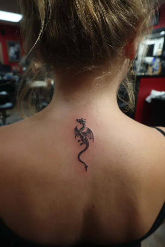This dainty dragon is placed along the upper spine, centered just below the nape of the neck. The fine black lines create a softly curled dragon with tiny wings and a slightly raised head. The design follows the vertical line of the spine beautifully, making it feel balanced and elegant.