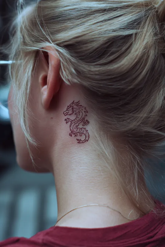 This petite dragon is inked behind the ear in a soft red tone, giving it a slightly playful and unique twist. The linework is fine and feminine, with a light curled tail and small wings that keep the design airy. The size is tiny, making it feel like a hidden gem.