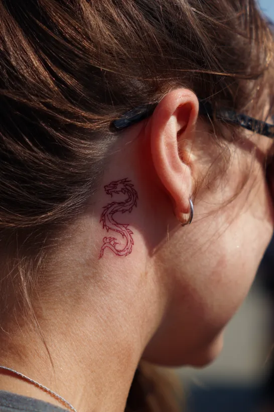Behind the ear tattoos always feel extra special to me. They are subtle, personal, and a little unexpected. I love how this tiny red dragon feels bold in color but still incredibly dainty.