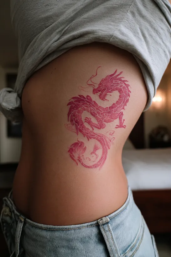 This mini dragon is placed along the ribcage, done in a soft pink tone with delicate linework. The body flows vertically, following the natural curve of the waist. The wings are lightly sketched, keeping the design airy and graceful.
