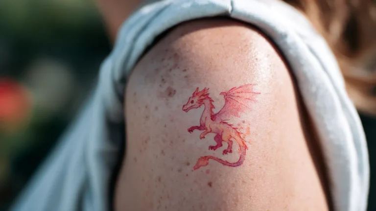This tiny dragon is placed on the upper shoulder, done in a very light fine line style that almost looks softly faded. The design is small and subtle, with thin strokes forming a petite flying dragon. Its placement makes it visible yet understated.