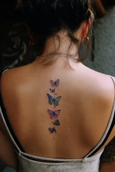 This enchanting tattoo showcases a graceful procession of butterflies in varying sizes, beautifully ascending the spine. Each butterfly is adorned with soft, dreamy washes of blues, purples, and pinks, giving them a whimsical, watercolor effect. Tiny speckles and subtle outlines add to their delicate charm, making it feel like they’re gently fluttering upwards along the elegant curve of the back.