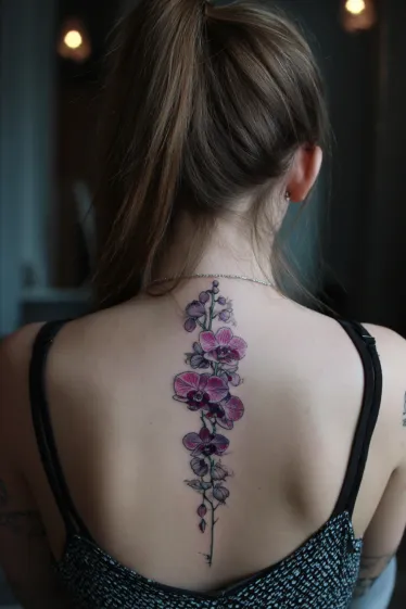 This exquisite tattoo showcases a delicate trail of vibrant orchids, blooming beautifully in shades of deep purple and bright pink, gracefully ascending the spine. Each blossom is intricately detailed, and the delicate stems and budding flowers add a touch of natural growth and elegance. The entire piece feels wonderfully organic and artistic, perfectly complementing the graceful curve of the back.